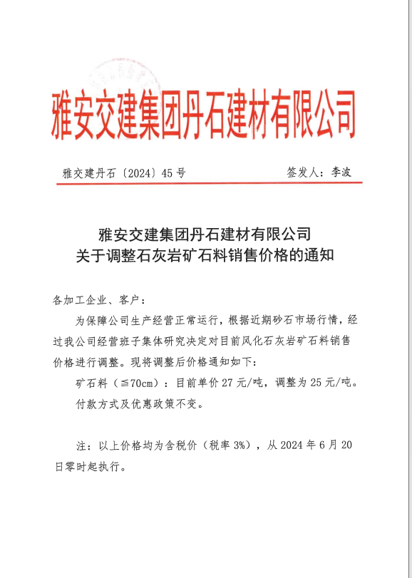 关于调整石灰岩矿石料销售价格的通知