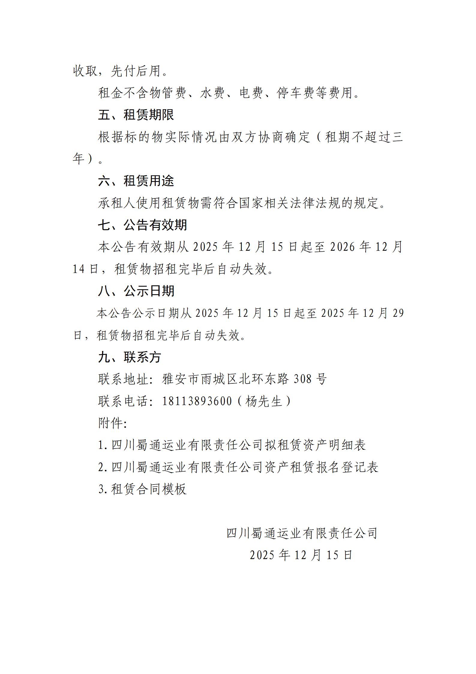 四川蜀通运业有限责任公司关于蜀通公司各区县闲置房屋商铺场地挂网招租的公告