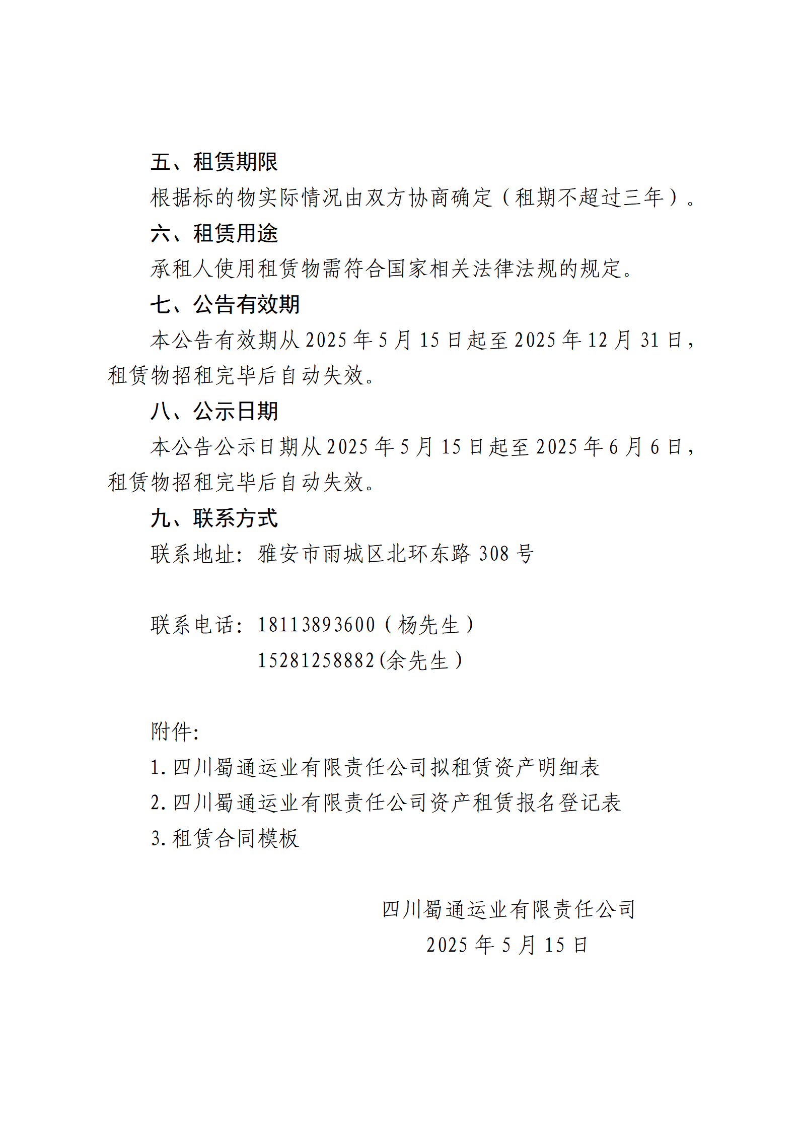 四川蜀通运业有限责任公司 关于雅安市宝兴县四处商铺资产进行二次挂网招租的公告
