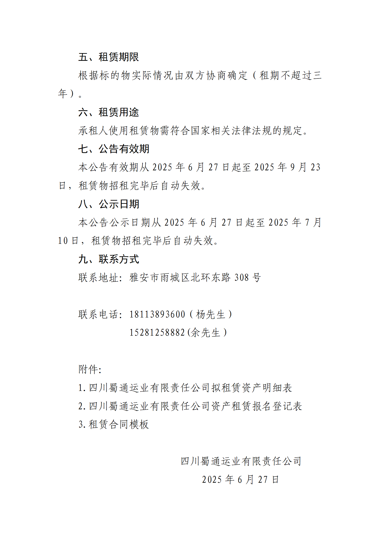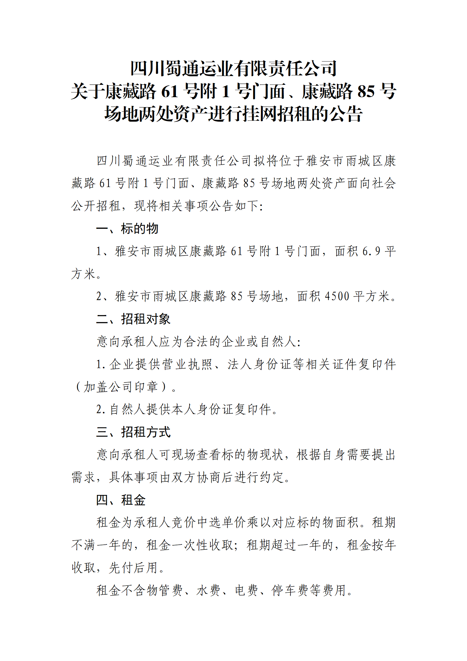 四川蜀通运业有限责任公司 关于康藏路61号附1号门面、康藏路85号场地两处资产进行挂网招租的公告