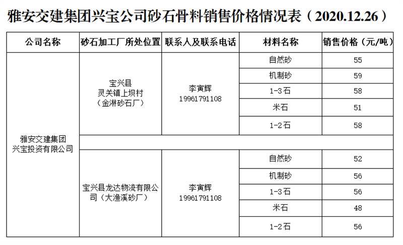 w66利来国际集团兴宝公司砂石骨料销售价格情况表(2020.12.26)