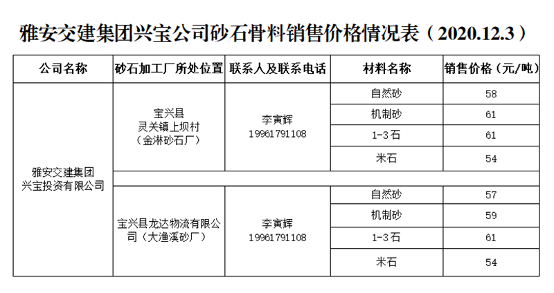 w66利来国际集团兴宝公司砂石骨料销售价格情况表(2020.12.3)