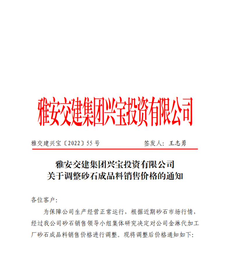 雅交建兴宝〔2022〕55号 关于调整砂石成品料销售价格的通知-11.5