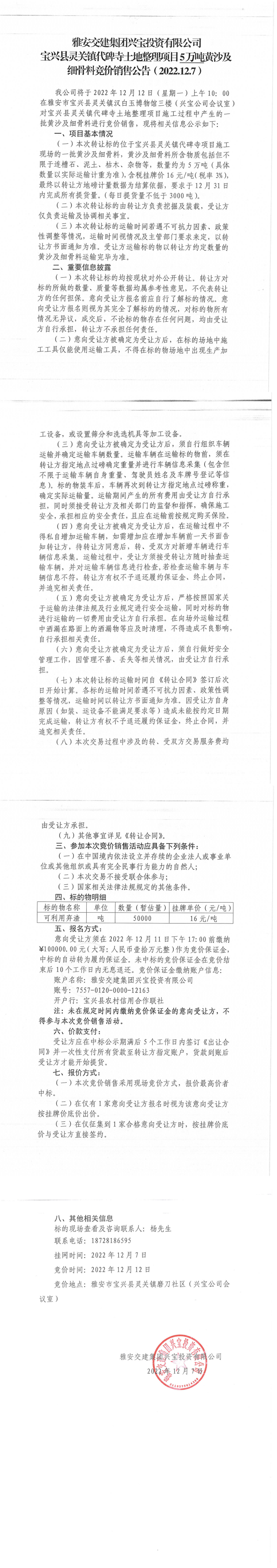 w66利来国际集团兴宝投资有限公司宝兴县灵关镇代碑寺土地整理项目5万吨黄沙及细骨料竞价销售成交公告(2022-12-12)