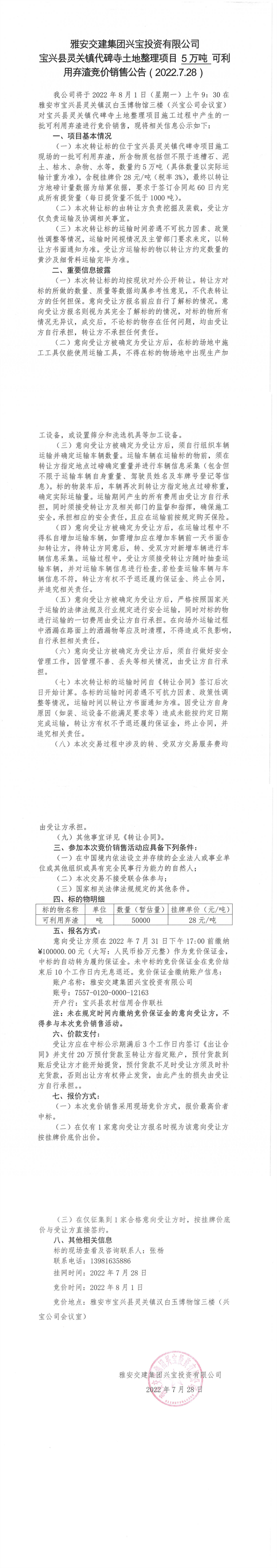 w66利来国际集团兴宝投资有限公司灵关镇代碑寺土地整理项目10万吨可利用弃渣竞价销售公告(2022.7.28)