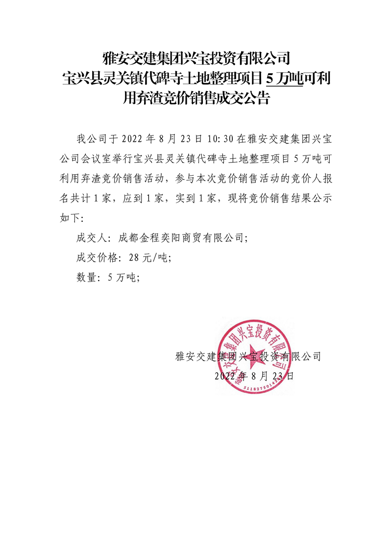 w66利来国际集团兴宝投资有限公司宝兴县灵关镇代碑寺土地整理项目10万吨可利用弃渣竞价销售成交公告(8.23)