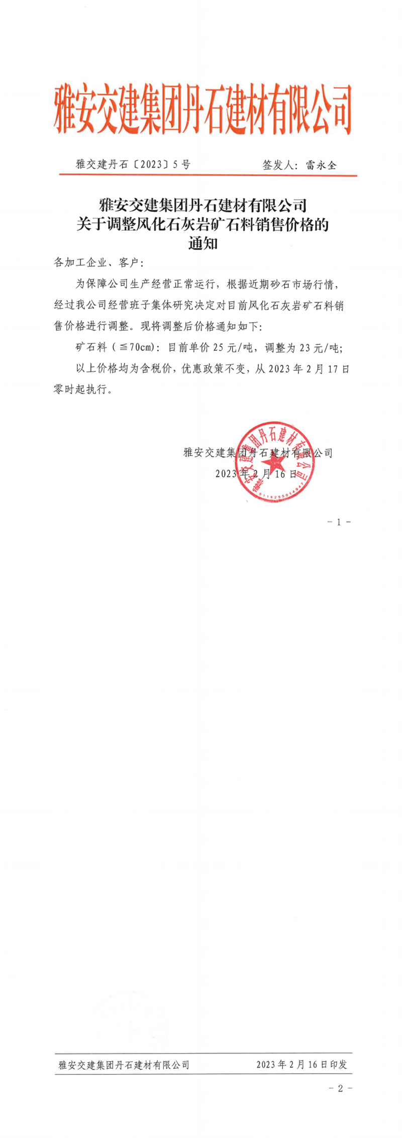 雅交建丹石(2023)5号调整风化石灰岩矿料销售价格的通知(2023.02.16)