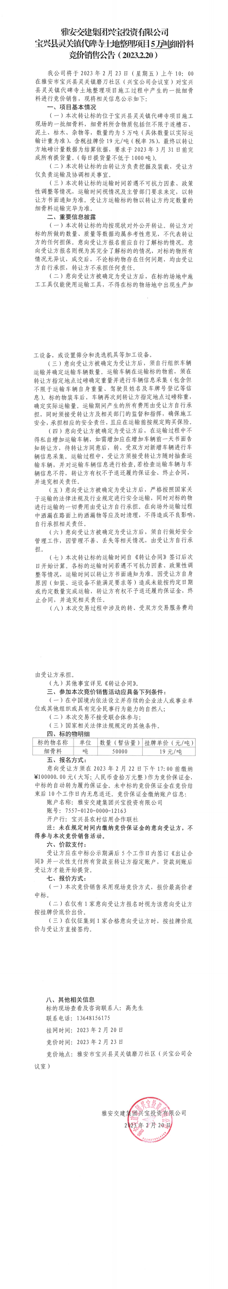 w66利来国际集团兴宝投资有限公司宝兴县灵关镇代碑寺土地整理项目5万吨细骨料竞价销售公告(2023.2.20)