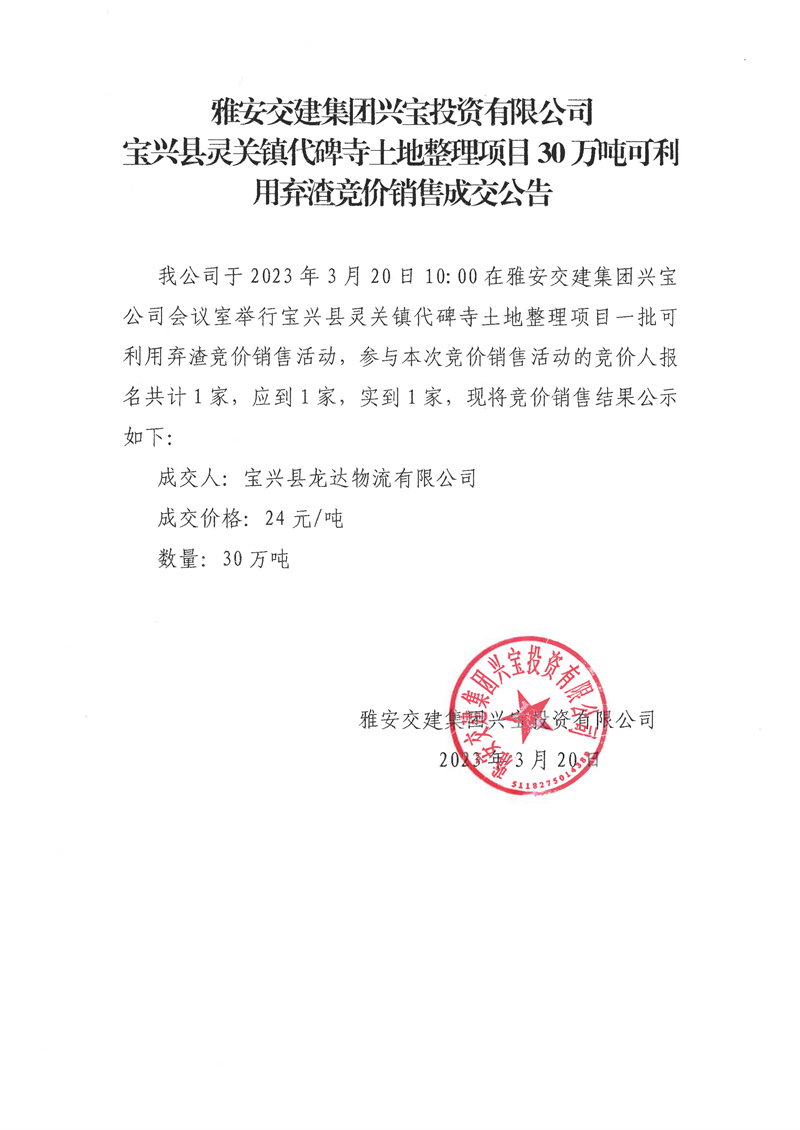 w66利来国际集团兴宝投资有限公司灵关镇代碑寺土地整理项目30万吨可利用弃渣竞价销售成交公告(2023.3.20)