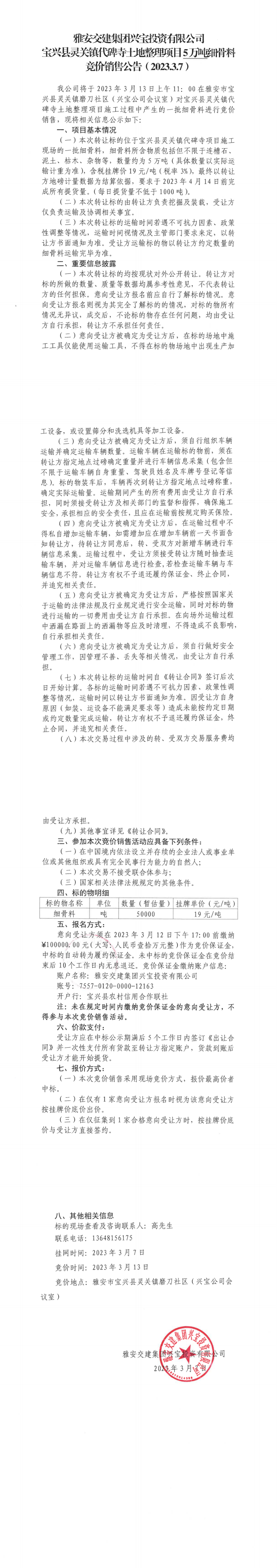 w66利来国际集团兴宝投资有限公司宝兴县灵关镇代碑寺土地整理项目5万吨细骨料竞价销售公告(2023.3.7)