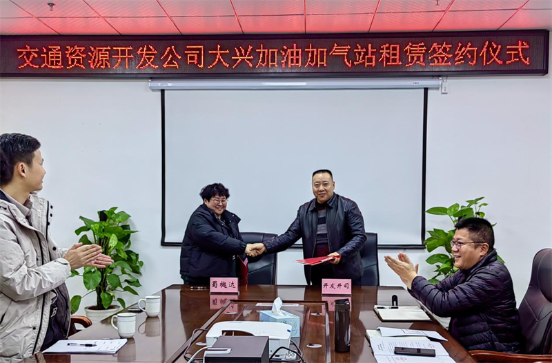 近期,w66利来国际集团交通资源开发有限责任公司(简称开发公司)与四川蜀樾达石油化工有限公司(简称蜀樾达石化)举行了大兴加油加气站租赁签约仪式,蜀樾达石化公司法人王娅、董事长方高勇,开发公司董事长、总经理王华,开发公司副总经理熊艳、张兵出席签约仪式。双方就租赁相关事项达成共识,顺利完成签约,大兴片区首个加油加气站即将投入运营。