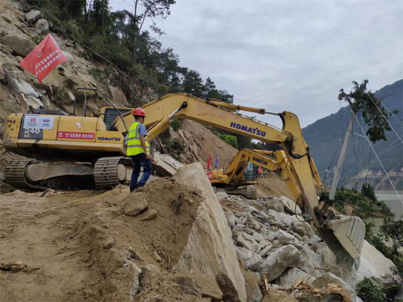 抢险队伍,马上出发!集团领导班子立即召开碰头会,分析研判形势,安排部署工作,密切关注震区态势,创建抗震救灾领导小组,副总经理钟焱宇率现场指挥组赶赴石棉靠前指挥抢险救灾。正在石棉G108线施工的康藏路桥公司项目部组成10人抢险救援小分队,携带挖掘机4台、拖车4台、装载机3台、交通运输车2辆、无人机1台,第一时间到就地抢险工作,震后7小时,完成国道G108线马富至菩萨岗约40公里路段、6处塌方点1600余方土石方清理,尔后转战石棉县新民乡进行通乡道路抢通作业。