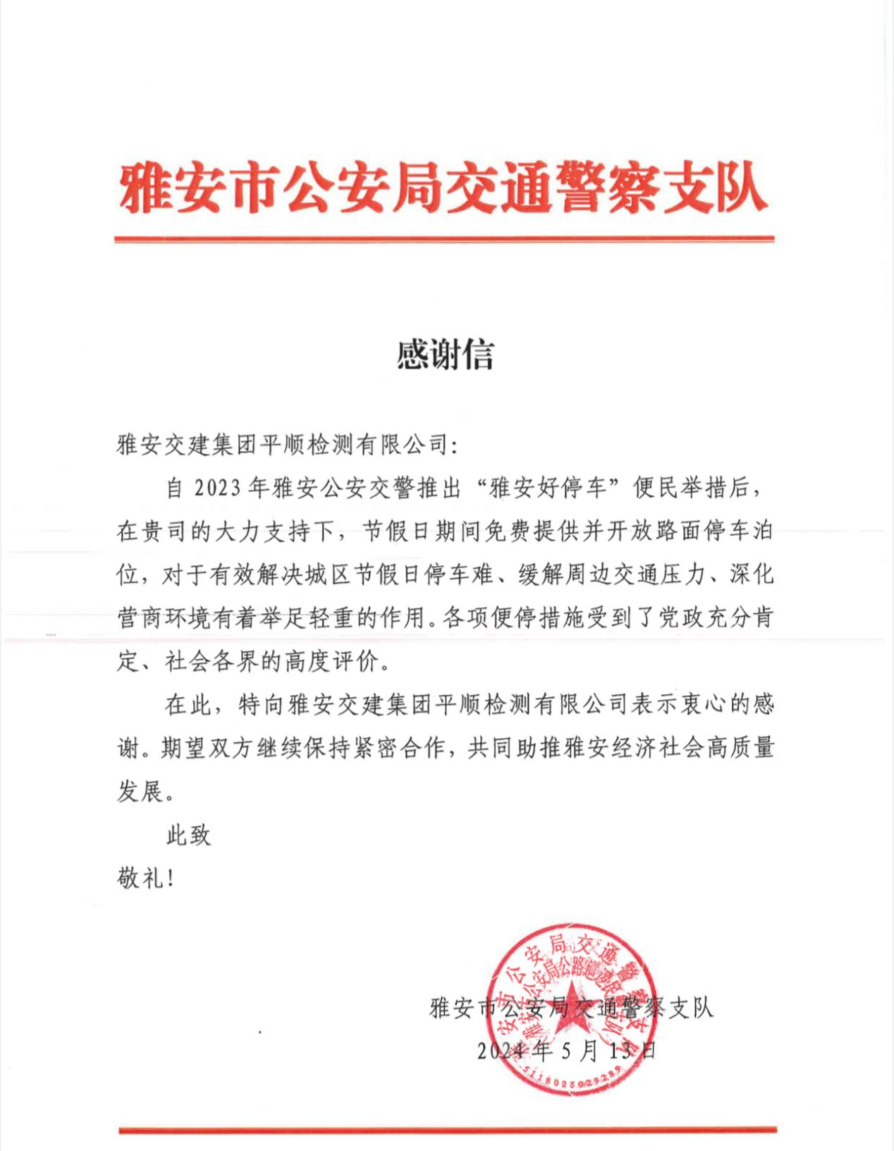 近期,w66利来国际集团平顺公司收到一封来自雅安市公安局交通警察支队的感谢信,对平顺公司持续响应雅安公安交警“雅安好停车”便民措施,在节假日期间免费给予并开放路面停车泊位表示感谢。