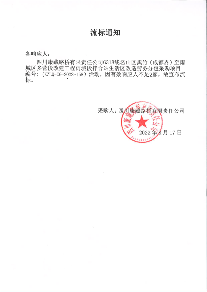 四川康藏路桥有限责任公司G318线名山区黑竹(成都界)至雨城区多营段改建工程雨城段拌合站生活区改造劳务分包采购项目流标通知