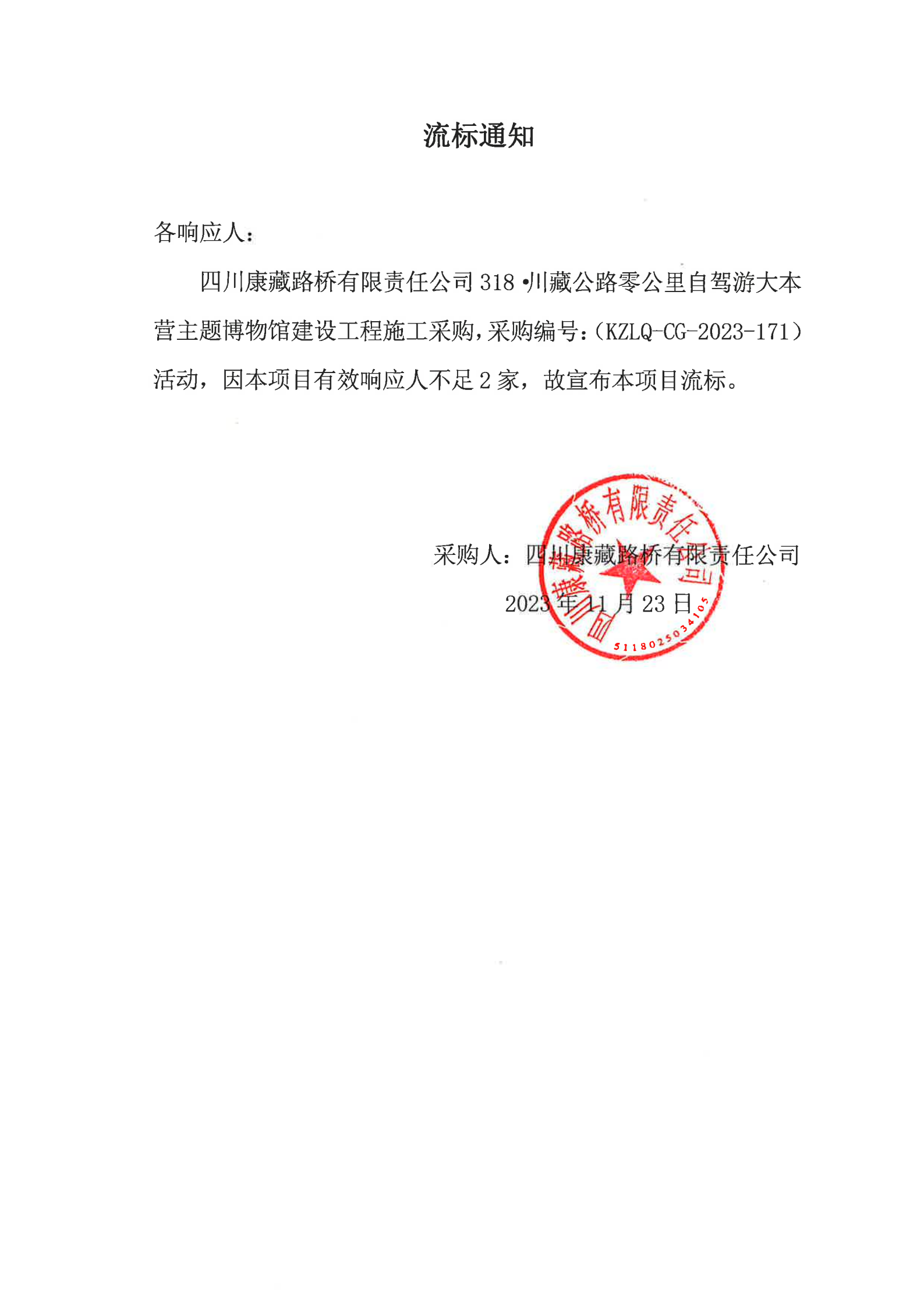 四川康藏路桥有限责任公司318·川藏公路零公里自驾游大本营主题博物馆建设工程施工采购流标通知