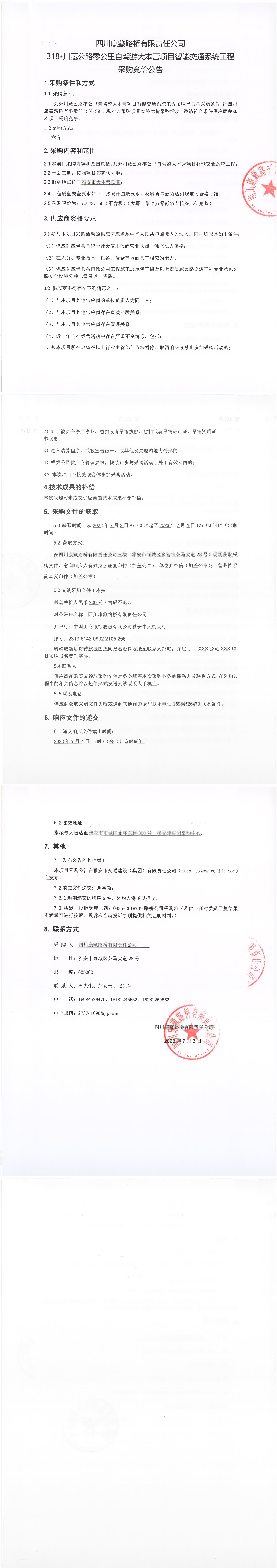四川康藏路桥有限责任公司318·川藏公路零公里自驾游大本营项目智能交通系统工程采购竞价公告