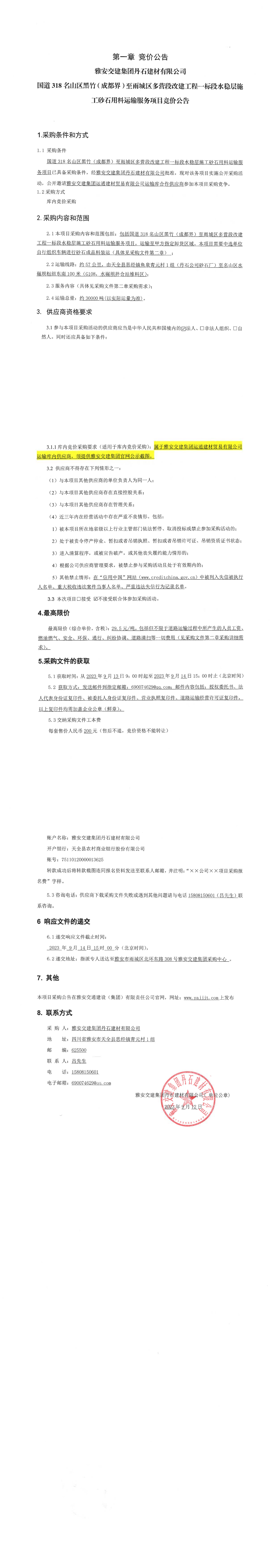 w66利来国际集团丹石建材有限公司国道318名山区黑竹(成都界)至雨城区多营段改建工程一标段水稳层施工砂石用料运输服务项目竞价公告