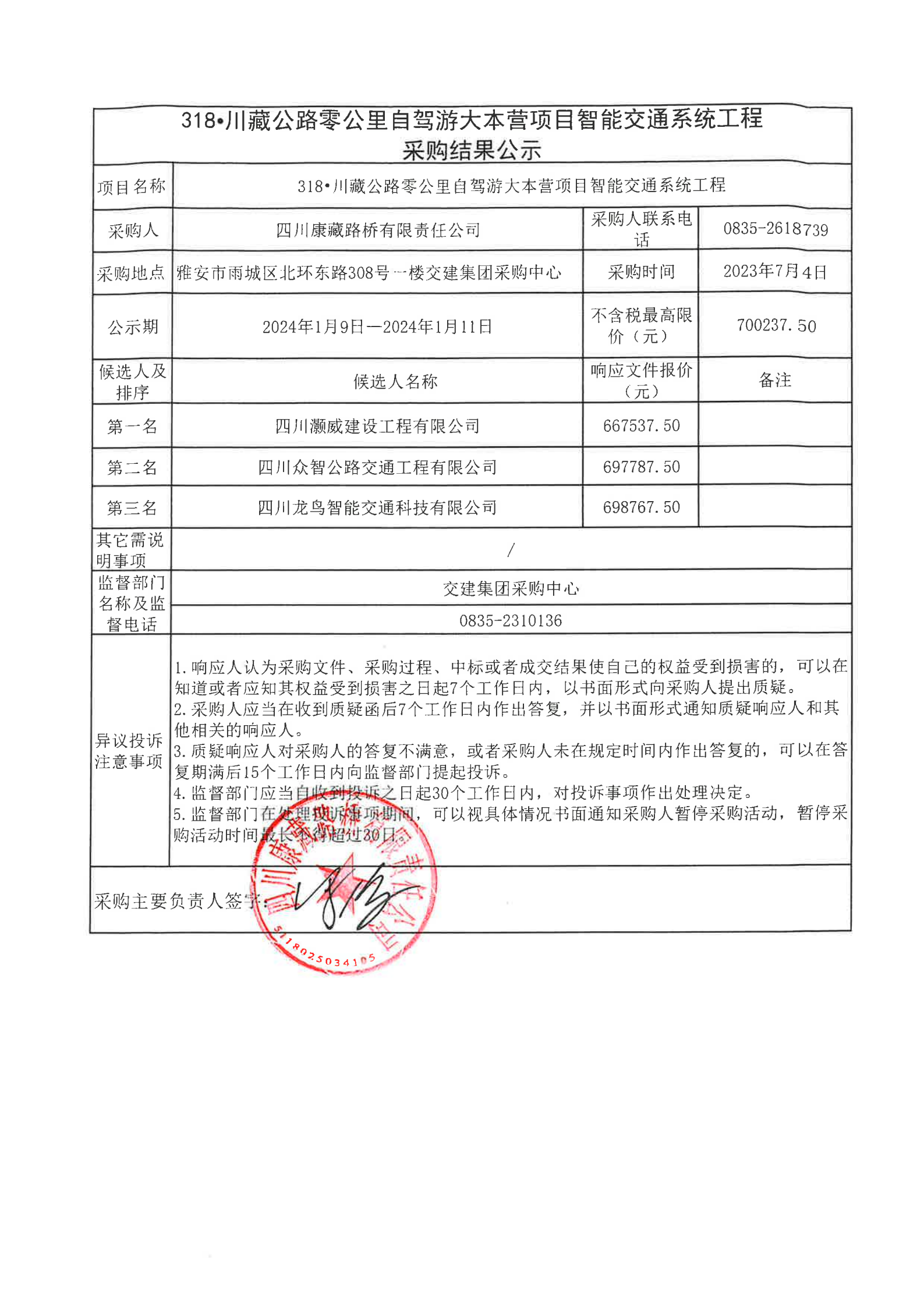 四川康藏路桥有限责任公司318·川藏公路零公里自驾游大本营项目智能交通系统工程采购结果公示