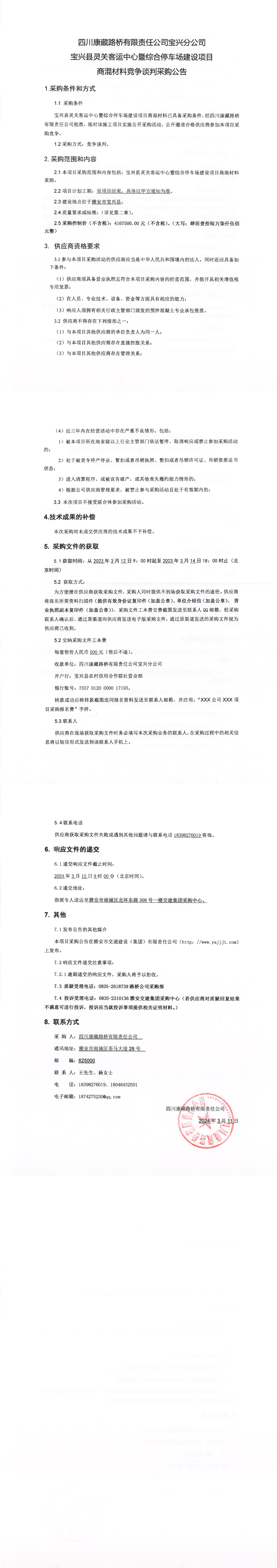 四川康藏路桥有限责任公司宝兴县灵关客运中心暨综合停车场建设项目商混材料竞争谈判采购公告