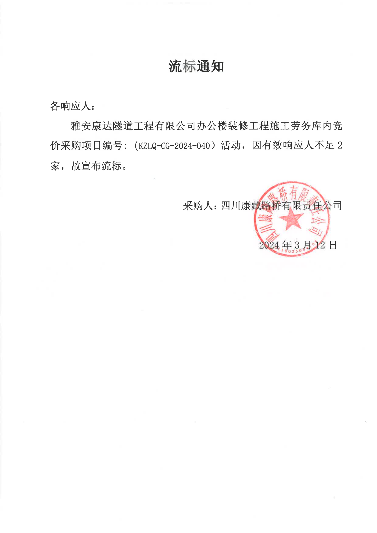 雅安康达隧道工程有限公司办公楼装修工程施工劳务库内竞价采购流标通知