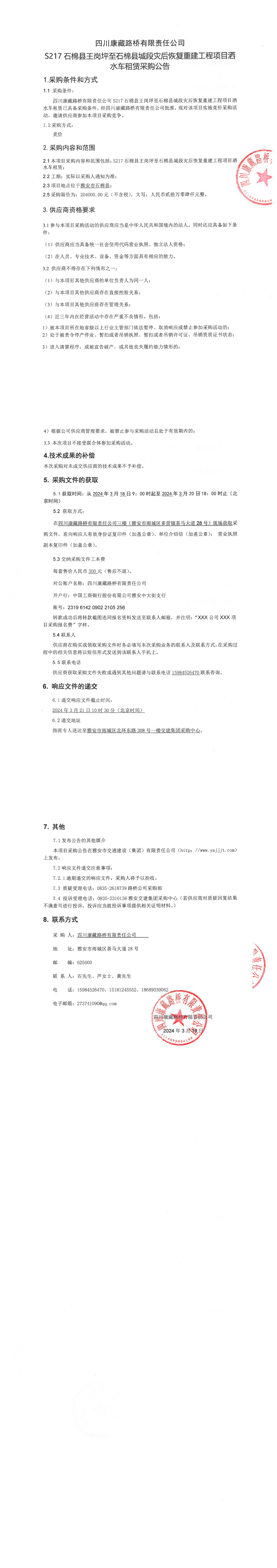 四川康藏路桥有限责任公司S217石棉县王岗坪至石棉县城段灾后恢复重建工程项目洒水车租赁采购公告