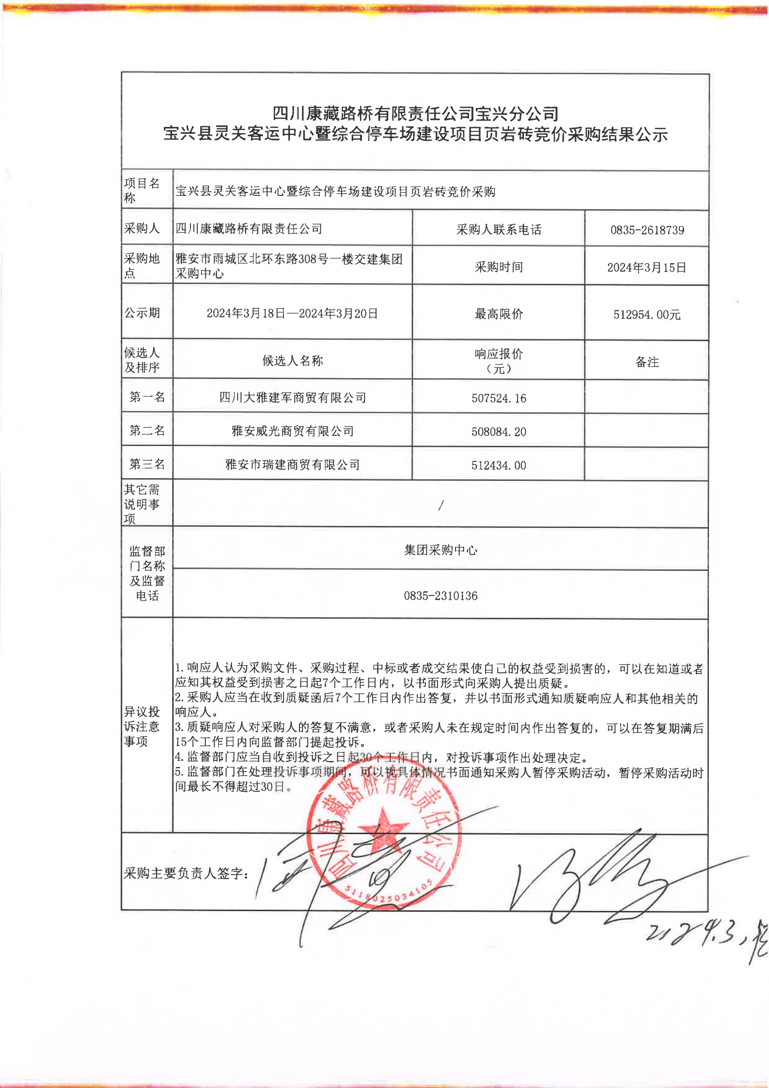 四川康藏路桥有限责任公司宝兴分公司宝兴县灵关客运中心暨综合停车场建设项目页岩砖竞价采购结果公示