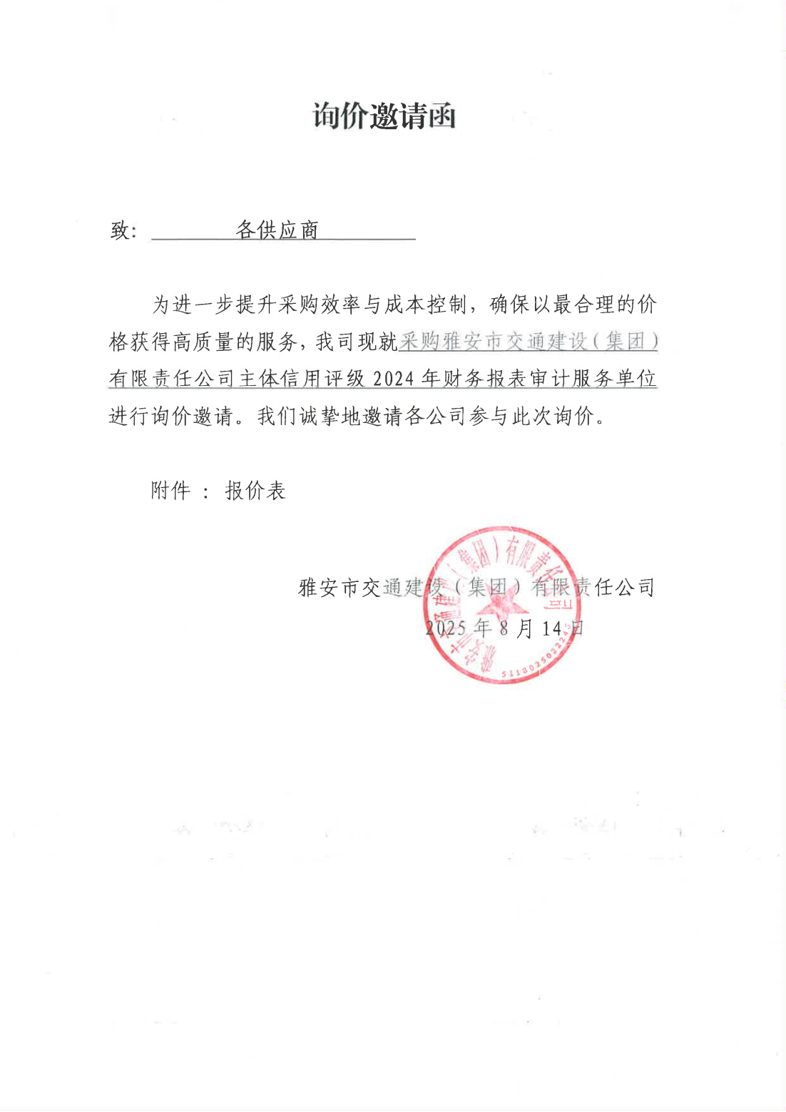 关于采购雅安市交通建设(集团)有限责任公司主体信用评级2024年财务报表审计服务单位的询价函