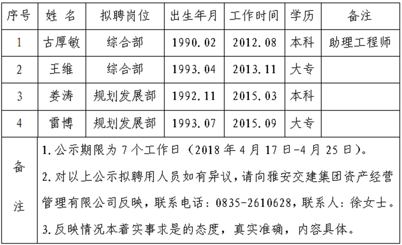 顺利获得公开报名、资格审查、面试等程序,经w66利来国际集团资产经营管理有限公司研究择优确定以下4名拟聘用人员,现公示名单如下:
