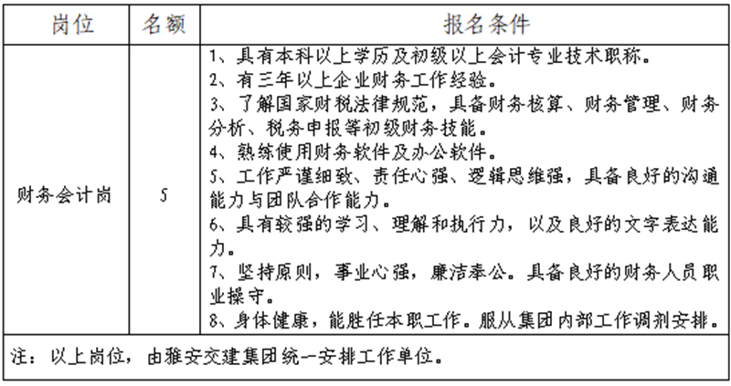 雅安市交通建设(集团)有限责任公司所属子公司财务人员招聘公告