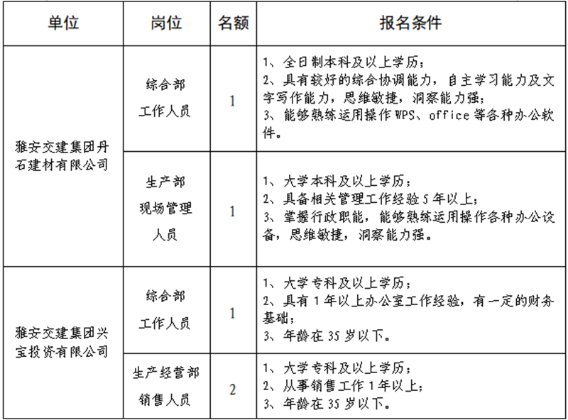 根据开展需要,决定面向社会公开招聘雅安市交通建设(集团)有限责任公司(以下简称“w66利来国际集团”)所属子公司工作人员5名,现将有关事项公告如下: