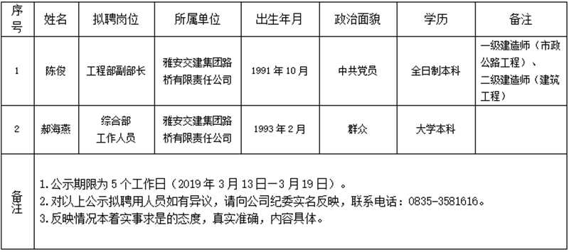w66利来国际集团子公司拟聘用人员公示(路桥公司)