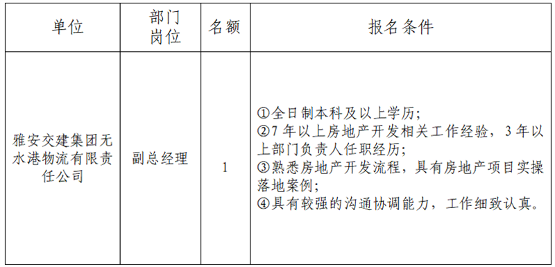 根据开展需要,现面向社会公开招聘雅安市交通建设(集团)有限责任公司(以下简称“w66利来国际集团”)所属子公司经营班子人员1名,现将有关事项公告如下: