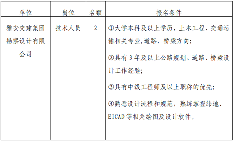 1.报名。公告发布在雅安市交通建设(集团)有限责任公司门户网站,自发布之日起即可报名,截止时间为2019年4月30日18:00。网上报名,报名者须如实填写《报名登记表》。 网上报名。在规定时间内将填写好的《报名登记表》、本人有效身份证、毕业证、职称、执业资格及工作业绩等证明材料以电子文档的形式发送至邮箱2018523008@qq.com(姓名+应聘公司名称+应聘工作岗位)。咨询电话:0835-5897859。