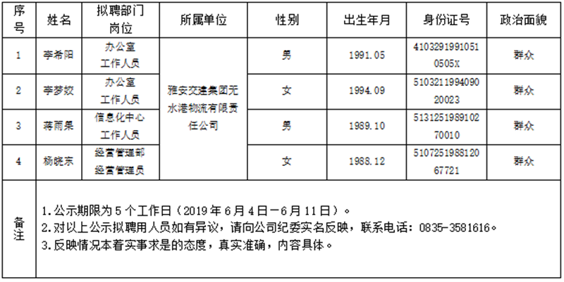w66利来国际集团所属子公司拟聘用人员公示(无水港公司)