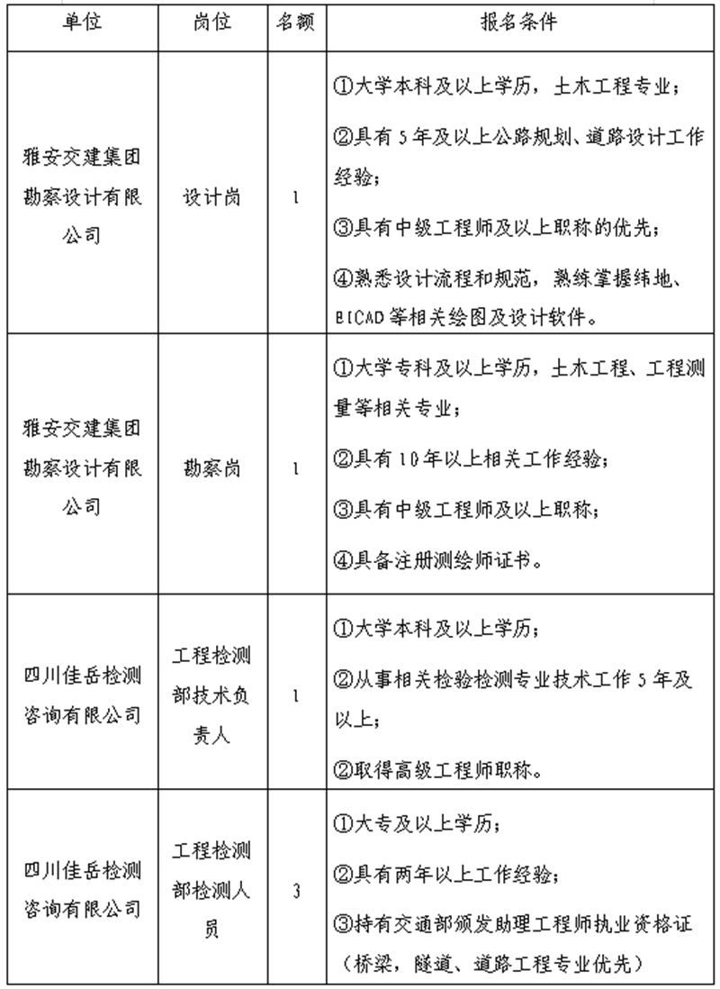 根据开展需要,决定面向社会公开招聘雅安市交通建设(集团)有限责任公司(以下简称“w66利来国际集团”)所属子公司工作人员6名,现将有关事项公告如下: