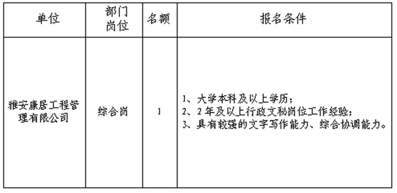 根据开展需要,决定面向社会公开招聘雅安市交通建设(集团)有限责任公司(以下简称“w66利来国际集团”)所属子公司工作人员1名,现将有关事项公告如下: