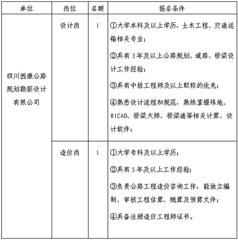 1.报名。公告发布在雅安市交通建设(集团)有限责任公司门户网站,自发布之日起即可报名,截止时间为2019年7月5日18:00。网上报名,报名者须如实填写《报名登记表》。 网上报名,在规定时间内将填写好的《报名登记表》、本人有效身份证、毕业证、职称、执业资格及工作业绩等证明材料以电子文档的形式发送至邮箱2018523008@qq.com(姓名+应聘公司名称+应聘工作岗位)。咨询电话:0835-5897859。