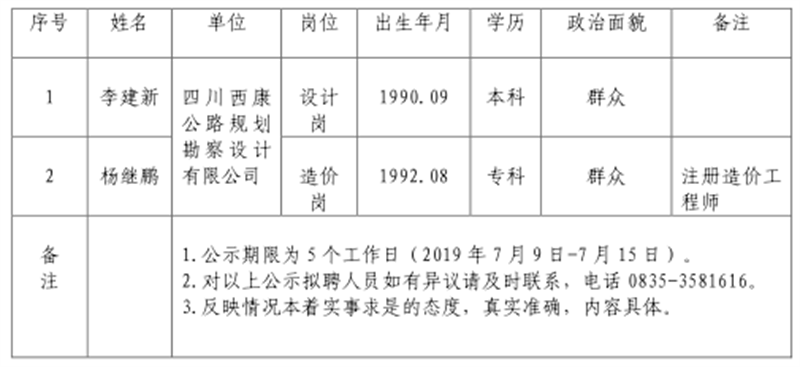 根据集团公司《人才选聘实施办法》,通过资格审查、面试、体检、考察等程序,经集团公司研究,对以下拟聘用人员予以公示: