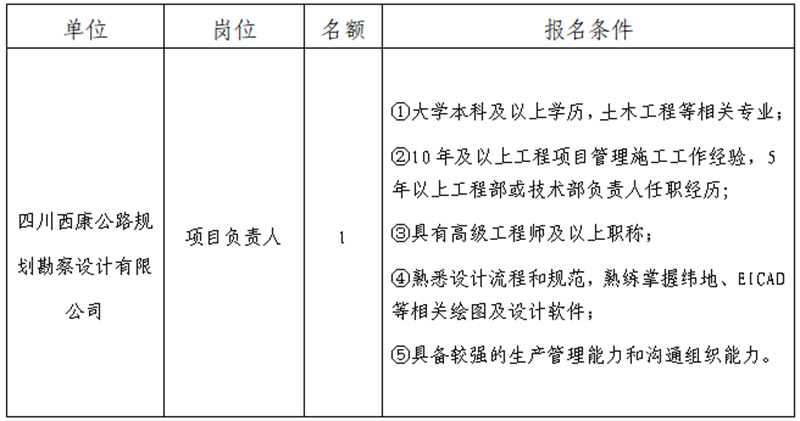 根据开展需要,决定面向社会公开招聘雅安市交通建设(集团)有限责任公司(以下简称“w66利来国际集团”)所属子公司项目负责人1名,现将有关事项公告如下: