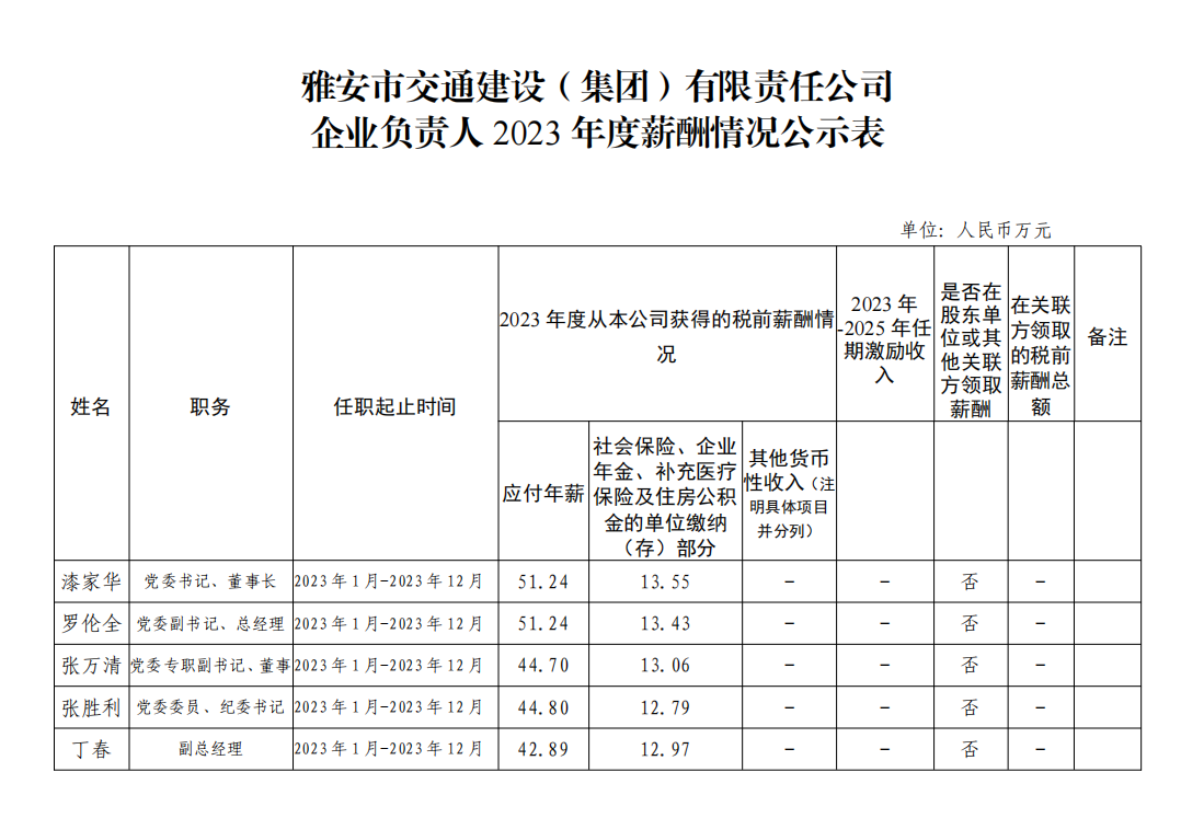 雅安市交通建设(集团)有限责任公司 企业负责人2023年度薪酬情况公示表
