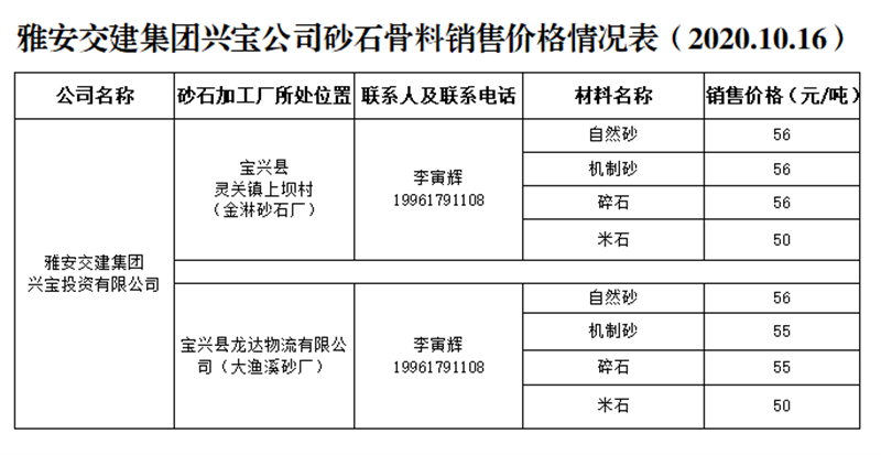 w66利来国际集团兴宝公司砂石骨料销售价格情况表(2020.10.16)
