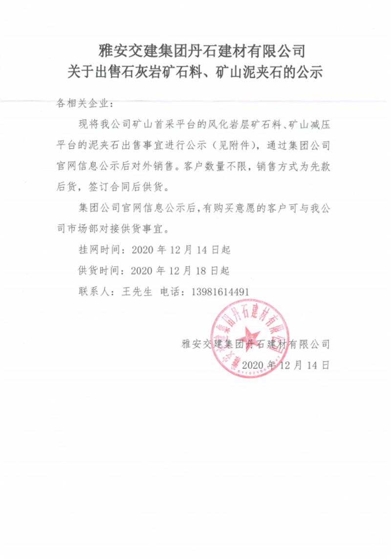 w66利来国际集团丹石建材有限公司关于出售石灰岩矿山料、矿山泥夹石的公示