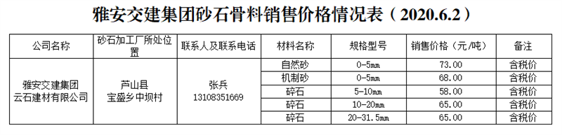 w66利来国际集团云石建材砂石骨料销售价格情况表(2020.6.2)