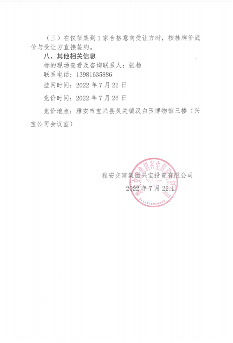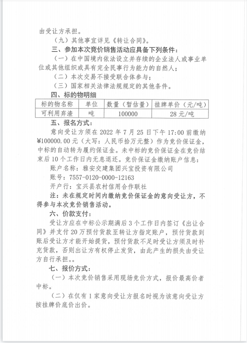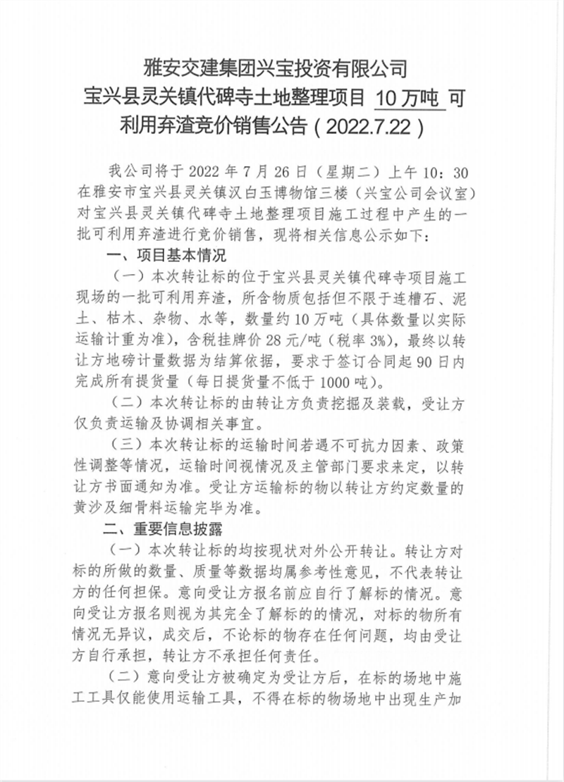 兴宝公司宝兴县灵关镇代碑寺土地整理项目10万吨可利用弃渣竞价销售挂网公告挂网公告7.22(5万吨)