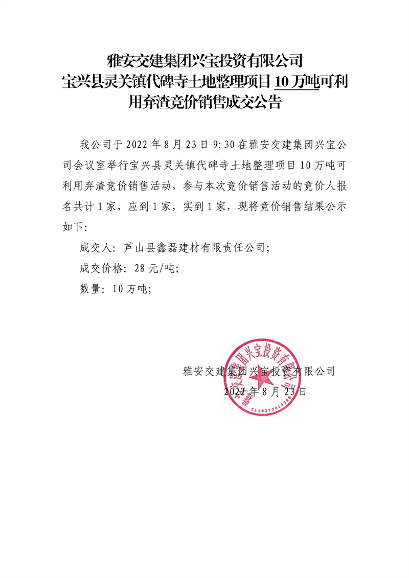 w66利来国际集团兴宝投资有限公司宝兴县灵关镇代碑寺土地整理项目10万吨可利用弃渣竞价销售成交公告(8.23)